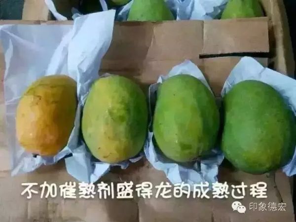 而添加了催熟剂的芒果则青色中略带白色,经过10天左右(根据发货的时间不同)会同一时间段变成黄中带白的颜色,经过15天左右芒果表皮慢慢长满黑色斑点,并最后腐烂发臭。(以上情形均为芒果保存完好,无碰撞、挤压)