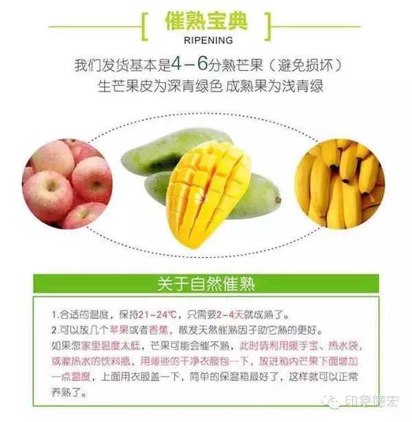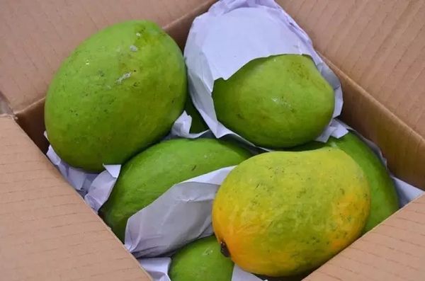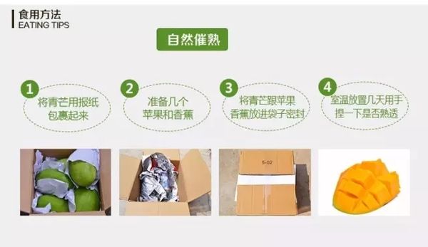 收到芒果后还比较绿的顾客记得千万不要放进冰箱,可以就直接放在箱子里,用厚一点的衣服盖住。或者放一根香蕉,或苹果在里面,熟的比较快。热带水果寄到冷地方熟的比较慢,熟后皮会有点皱,但不影响口感。