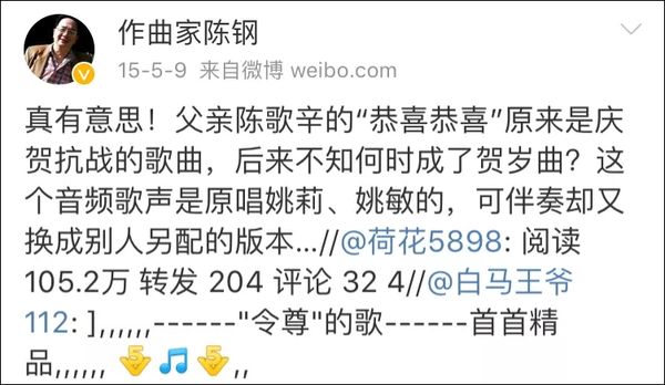 第二年,恰逢抗战胜利后的第一个春节,心潮澎湃的陈歌辛再次拿起笔来创作了《恭喜恭喜》。他想描述的不是别的,而是中国人经历八年战争的煎熬,终于苦尽甘来,迎接胜利的画面。2015年,陈歌辛长子,同时也是《梁祝》作者的@作曲家陈钢 也在微博上证实了这一信息。