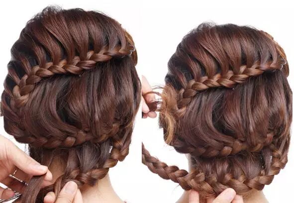 4、一直编到耳侧,把侧面的头发也要编进一到两缕。然后再向回编,编的时候和第一层的编法是一样的,尽量编的时候把力量均匀,这样弧度才好看。