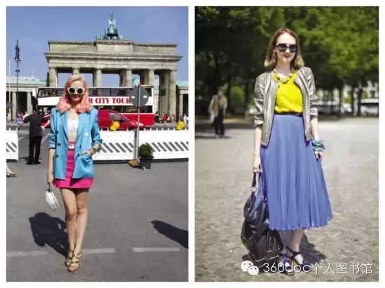 如果一定要用糖果色等较饱和色系,最好在上半身为素色的情况下,将其放在下半身,以减少其对面部肤色的影响。