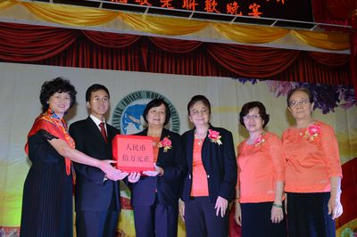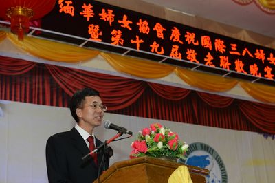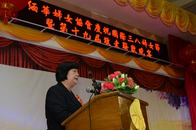中华人民共和国驻缅甸大使杨厚兰阁下,肯定了缅华妇女协会为中缅友谊和缅华社会发展所起到的积极作用和作出的突出贡献,特别对妇女协会开展华文教育对中华民族文化传承的推动作用给予充分的肯定和高度的赞誉!并承诺将继续不余遗力的支持缅华妇协的华文教育事业。杨厚兰大使阁下和夫人阮蔚女士代表使馆向缅华妇女协会捐助节庆文化用品赞助金10万元人民币,由李为华主席,叶雪金副主席,江才艺副主席、曾圆香副主席代表妇女协会接受捐赠。叶雪金副主席在捐赠仪式结束后,由衷的致了谢词,向68年来,致力于缅华妇女协会发展的巾帼英雄们致以崇高的敬意!同时向一直以来关怀和支持,缅华妇协发展的各级领导,热心侨贤,各界朋友,致以崇高的敬意。