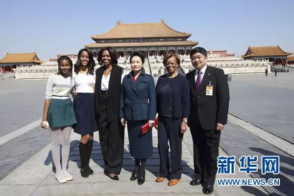 仲春时节的北京,阳光明媚,春意盎然,故宫的红墙黄瓦在湛蓝的天空下格外明艳。在太和殿前,彭丽媛同米歇尔及家人合影。