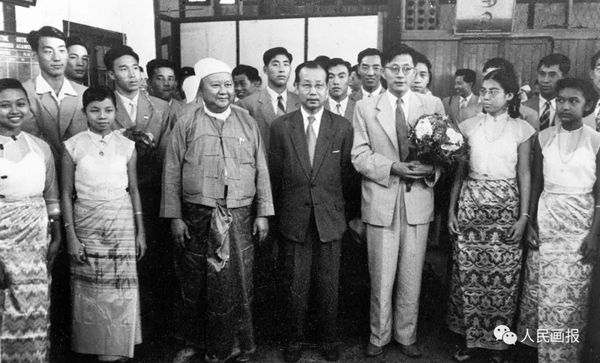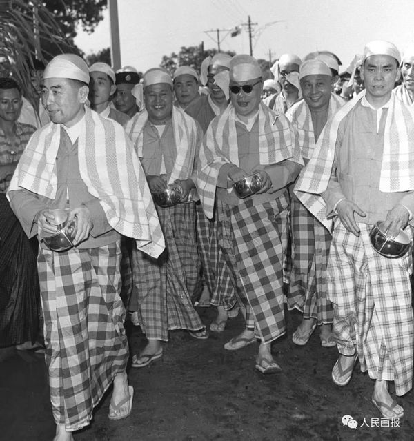 1960年4月15日,身着缅甸传统服装的中华人民共和国国务院总理周恩来、副总理陈毅与缅甸人民一起欢度传统佳节——泼水节。新华社 供图