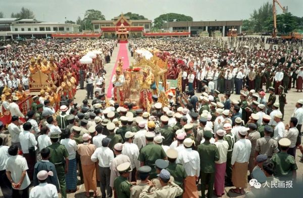 缅甸仰光国际机场举行的盛大欢迎佛牙仪式。以中国佛教协会副会长明旸法师为首的供奉团护送中国珍藏的释迦牟尼佛牙舍利,于1994年4月20日至6月5日在缅甸作了45天的供奉巡礼。新华社 供图