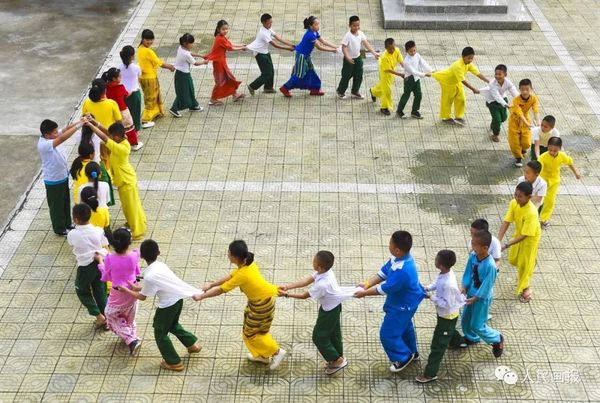 2019年3月8日,中国云南省瑞丽市姐相乡银井小学,中缅两国学生在课间休息时一起做游戏。国境线将银井村一分为二,是典型的“一寨两国”村落。同一片蓝天下,宁静和谐的美丽校园,见证着中缅两国小朋友胞波情深的同窗之谊。新华社 供图