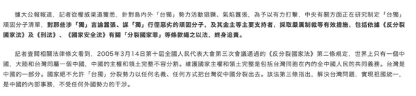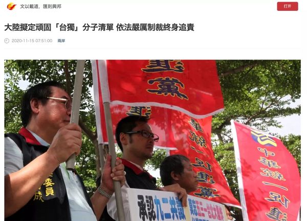 据《大公报》报道,记者从权威渠道获悉,针对岛内外“台独”势力活动猖獗、气焰嚣张,为予以有力打击,中央有关方面正在研究制定“台独”顽固分子清单,对那些涉“独”言论嚣张、谋“独”行径恶劣的顽固分子,及其金主等主要支持者,采取严厉制裁等有效措施,包括依据《反分裂国家法》及《刑法》、《国家安全法》有关“分裂国家罪”等条款绳之以法,终身追责。