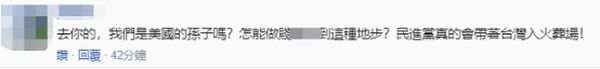 有人讽刺,“真是弹性‘外交’呀,超级弹性到卑躬屈膝!”还有人毫不客气地说,“去你的,我们是美国的孙子吗?怎能做贱到这种地步?民进党真的会带着台湾入火葬场!”