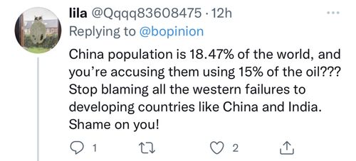 “中国人口占全球的18.47%(按2021年年末数据,应约为18%),你们却指责他们石油消费量占全球的15%?别再把西方的失败怪到中国和印度这样的发展中国家身上,真可耻!”
