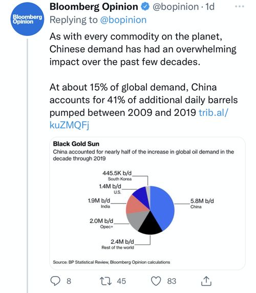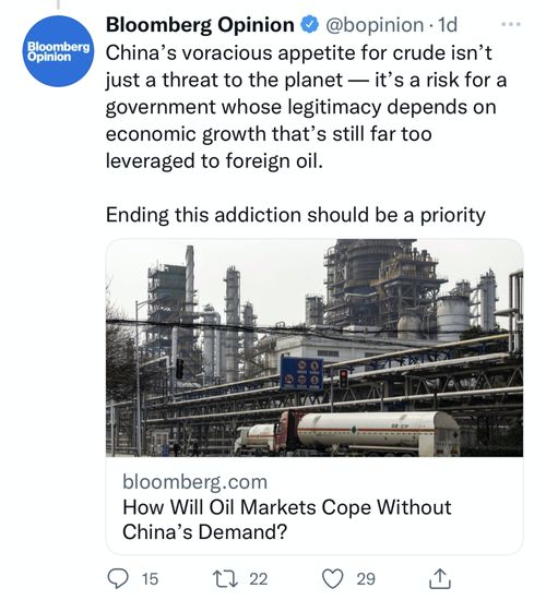 北京时间3月30日,一向爱对中国发展指指点点的彭博社社评版块“Bloomberg Opinion”发布了一篇题为《没有中国的需求,石油市场将如何应对?》的文章,炒作“中国巨大的原油需求威胁世界”论,宣称中国对储备石油“上瘾”,需求“贪婪”,这会对地球“构成威胁”,给环境带来负担。