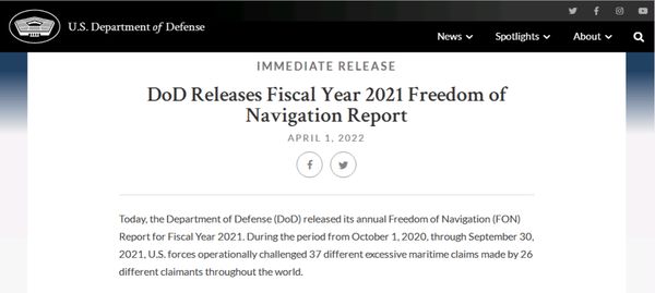 美军发布所谓年度“航行自由行动报告”,共37次,涉及中国最多
