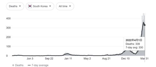 在奥密克戎变种出现之前,韩国的防疫政策主要是“检测、追踪、治疗”三步曲,即接触者追踪、社交距离措施和确诊者隔离,这在奥密克戎变体流行之前本来是颇为有效的。但为了紧跟欧美国家的脚步,韩国政府在今年年初放松了防疫限制,加上奥密克戎的影响,今年2月之后,韩国每天的新增感染者人数都保持在10万以上,最近几周更是保持在30万以上,最高的一天达到62万人(3月17日)。到3月30日韩国总确诊人数到达12774956人,已经接近韩国人口的四分之一。累计死于新冠的人数达到15855人,绝大多数死亡发生在最近一轮的奥密克戎变体爆发期间。最近一周的日均死亡人数是330人。