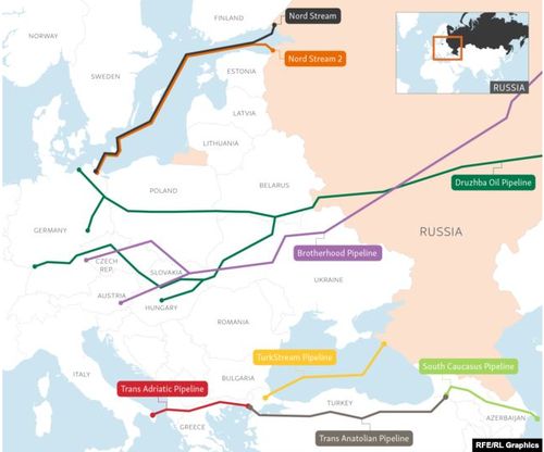 俄罗斯与欧洲之间主要的能源通道 图片来源见水印
