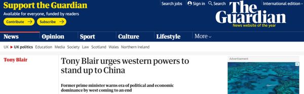 据英国《卫报》报道,英国前首相布莱尔当地时间周六(16日)出席迪奇雷基金会年度讲座时,就西方世界和国际局势发表讲话。他认为,西方的“政治和经济主导地位正走向终结”,而以实力而言,中国成为超级大国是理所当然的。布莱尔表示,西方应该在多个领域应对来自中国的竞争,而这被英国媒体解读为他在“敦促西方对抗中国”。