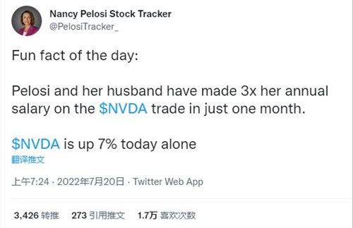 20日:今天一个有趣的事实:佩洛西和她的丈夫在短短一个月内通过英伟达的相关交易赚了3倍的年薪。仅仅是今天,英伟达股价就上涨了7%。