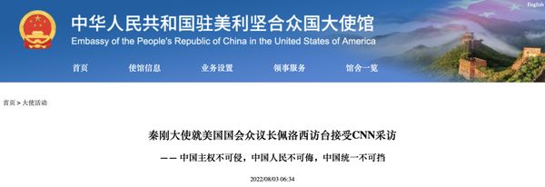 秦刚大使就美国国会众议长佩洛西窜访台接受CNN采访—— 中国主权不可侵,中国人民不可侮,中国统一不可挡