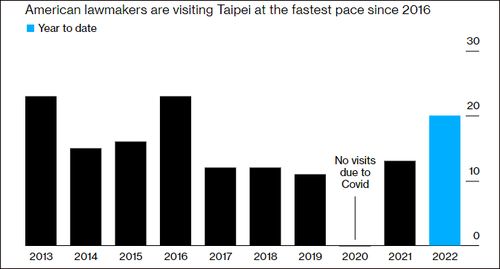 8月15日,彭博社发文指出,佩洛西等人窜台只是美国国会近期一系列涉台行动中的一部分。数据显示,过去十年来,至少有149名美国国会议员窜台,其中共和党人约占60%;特朗普政府时期共有35名,而就在拜登执政仅仅一年多以来,就有33名议员窜访台湾地区。