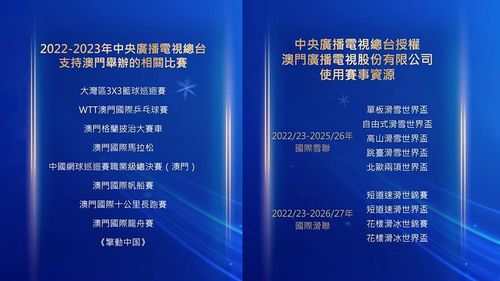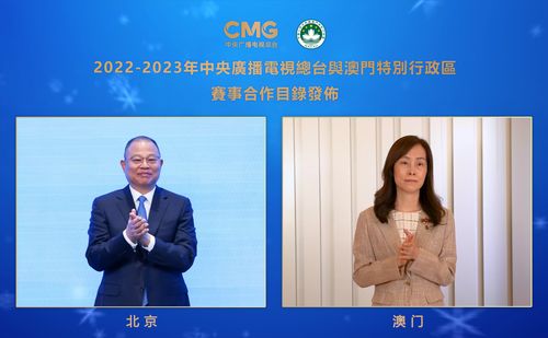 中央广播电视总台编务会议成员薛继军与澳门特别行政区社会文化司司长欧阳瑜共同发布了《2022-2023年中央广播电视总台与澳门特别行政区赛事合作目录》,双方将进一步强化在体育赛事举办和赛事资源授权方面的合作。