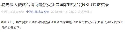 8月12日,易先良大使就台湾问题接受挪威国家电视台时政专栏记者菲力蒲·乌尔文的专访,答问实录如下: