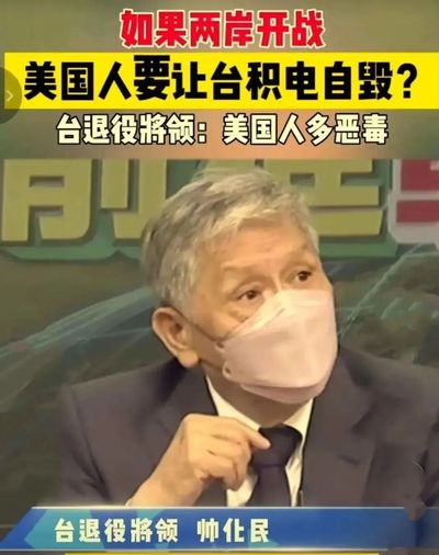 视频里,台湾地区退役将领帅化民愤怒地说:“万一两岸发生战争的时候,(美国说)台积电要自毁,你听懂什么叫自毁吗?自毁就是自己把它炸掉,它(美国)就不让你流落到中国大陆手上,你看(美国人)多恶毒!”