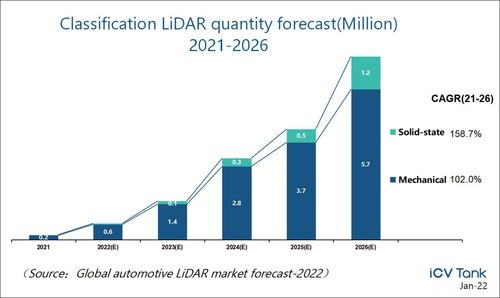 另一咨询机构ICV则在《2022全球汽车激光雷达市场预测》报告中表示,到2026年,全球车载激光雷达出货量将接近700万颗,达到当下的40倍左右。