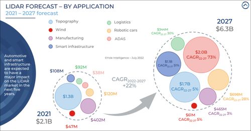 但Yole同时预测,随着高级别自动驾驶技术的发展,车载激光雷达的应用将变得更为普及。到2027年,仅ADAS激光雷达市场规模将达到20亿美元,是2021年的50倍以上,成为激光雷达行业最大的应用领域;与此同时,无人驾驶出租车(Robotaxi)2027年的市场规模也将增长近7亿美元,是去年的6倍。