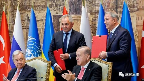 联合国秘书长古特雷斯(前排左)、土耳其总统埃尔多安(前排右)、俄罗斯国防部长邵伊古(后排右)与土耳其国防部长阿卡尔(后排左)。俄土国防部长在伊斯坦布尔签署乌克兰出口粮食协议。图自俄罗斯国防部