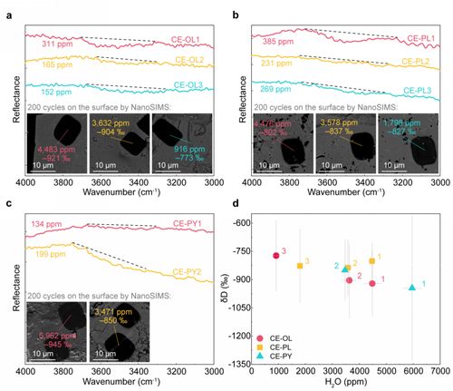 近日,中国科学院地球化学研究所科研团队针对嫦娥五号月壤样品开展了研究,通过红外光谱和纳米离子探针分析,发现嫦娥五号矿物表层中存在大量的太阳风成因水,估算出太阳风质子注入为嫦娥五号月壤贡献的水含量至少为170ppm。