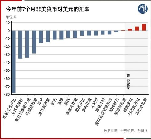 强势美元带来的,是非美货币的暴跌——世界银行统计了27种非美元货币今年前7个月的表现,其中23种货币对美元贬值: