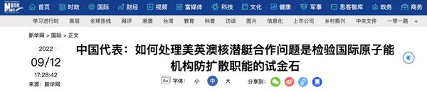 中国代表:如何处理美英澳核潜艇合作问题是检验国际原子能机构防扩散职能的试金石