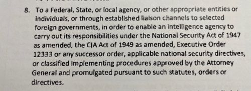 图:表格说明中,关于美国情报部门使用收集到的信息的“法律依据”