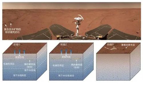 ▎祝融号在着陆区发现富含含水矿物的板状硬壳岩石及其在地下水作用下的形成过程示意图