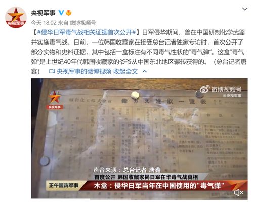 日军侵华期间,曾在中国研制化学武器并实施毒气战。日前,一位韩国收藏家在接受总台记者独家专访时,首次公开了部分实物和史料证据,其中包括一盒标注有不同毒气性状的“毒气弹”。