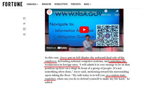 不仅如此,美国国安局定制访问行动(TAO)组织的负责人Rob Joyce还曾在2016年参加一场网络安全会议时,毫不遮掩地表示自己就是一名“政府背景的网络入侵者”(a nation state exploiter)。当时美国《财富》杂志网站也报道了此事,称他的讲话暴露出了他的雇主的“尴尬”的身份:一方面要维护美国的国家电脑系统安全,一方面则要入侵外国的系统。