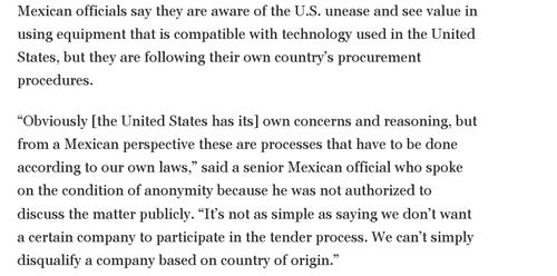 不过,墨西哥方面虽然收到了萨拉查的信,但并未理会美国的干涉,而是仍然决定从中国企业购入这批设备。《华盛顿邮报》称,墨西哥官员给出的回应是,尽管美国有美国的担忧和理由,但墨西哥也有墨西哥的法律和程序。