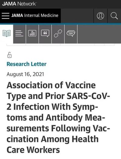 ▎图/ 2021年8月,一项关于新冠疫苗副作用与免疫反应之间潜在联系的研究发现,疫苗接种后没有症状“并不等同于缺乏疫苗诱导的抗体”。图源:Jama Network