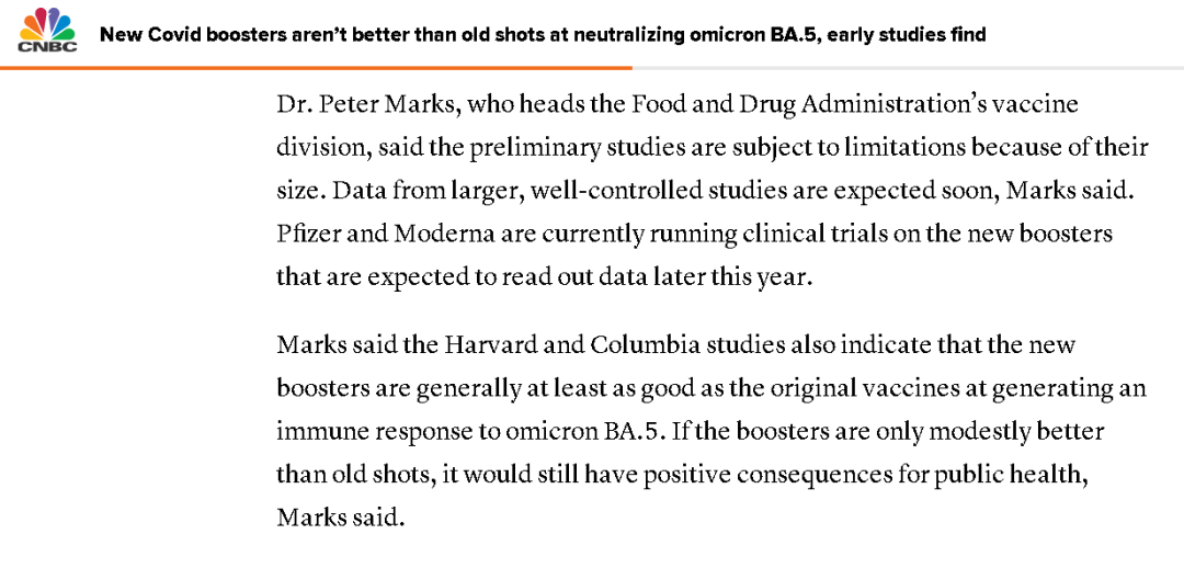 尽管这种疫苗已经得到美国政府的特批,且包括白宫、美国食品药品监督管理局以及美国知名传染病专家福奇在内的官方机构和人士都曾对这款疫苗表示有信心,但两所大学分别进行的、涉及21人(哥伦比亚)和18人(哈佛)的小规模采样研究却发现,这些先前注射过由莫德纳和辉瑞生产的第四针加强针疫苗的实验对象,在注射了两家公司新推出的针对BA.5变异毒株的双价疫苗后,并没有出现更好的免疫反应。