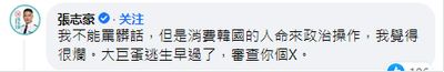 民众党籍台北市议员候选人张志豪称,“我不能骂脏话,但是消费韩国的人命来政治操作,我觉得很烂。”↓