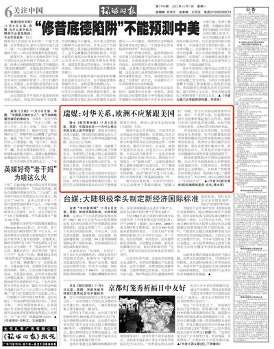 瑞士《新苏黎世报》11月4日文章,原题:中国综合征——为什么将北京视为敌人是不明智的 美国首先将北京视为威胁。现在欧洲的情绪也发生了变化。然而,欧洲不应简单地追随华盛顿,而应走自己的路。