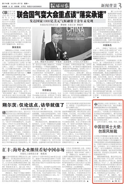 中国驻瑞士大使:若在乎瑞中关系,瑞士就应避免跟风制裁