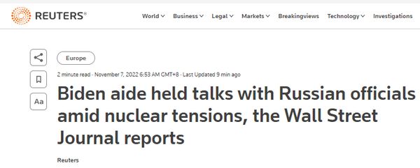 路透社:《华尔街日报》称,在核紧张局势中,拜登助手与俄罗斯官员进行谈话