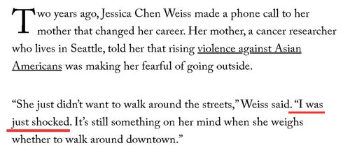 美国《纽约客》杂志近日就采访了这位名叫白洁曦(Jessica ChenWeiss)的女学者。从这篇采访来看,白洁曦之所以会站出来反对美国当下的对华政策方向,其中一个主要原因,是这种“不惜一切代价”也要遏制中国的政策,正在反噬美国国内,以至于她的母亲——一位癌症医生——曾在2年前与她通话时表示美国社会越发严重的“反亚裔”暴力事件已经让她不敢再出门了。