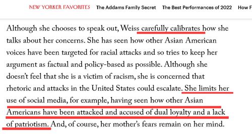 而在《纽约客》的采访中,该刊的记者也多次提及她在表达自己的观点时常常要“小心”和“谨慎”,尽量只从事实和政策的角度发声。这是因为其他一些对美国目前对华政策同样不满的亚裔美国人,已经因为表达反对的声音而遭到了种族主义的攻击。她甚至还不得不限制自己对社交媒体的使用,因为她看到其他一些在社交媒体上发声的亚裔美国人,已经被扣上了“对美国不忠诚”的帽子。