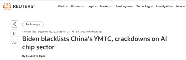 今年10月,美国商务部公布一系列针对集成电路领域的出口管制措施,从技术、产品、设备、服务等方面对中国进行全面限制,以阻断中国研发和生产先进半导体芯片的能力。与此同时,美国政府还敦促荷兰、日本和其他拥有尖端设备制造公司的未指明国家和地区跟随美国的脚步,对华采取类似出口管制规则。根据媒体此前报道,有消息人士称拜登政府最快可能在本周宣布将包括长江存储等在内的30多家中国企业列入实体清单,限制这些公司从美国购买材料和配件。