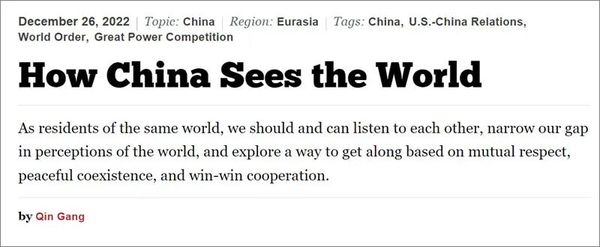 据外交部网站,2022年12月26日,中国驻美国大使秦刚在美国《国家利益》杂志发表题为《中国的世界观》的署名文章。全文译文如下: