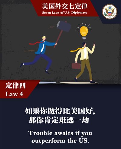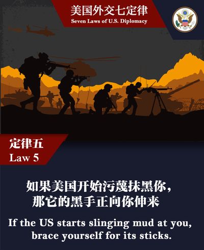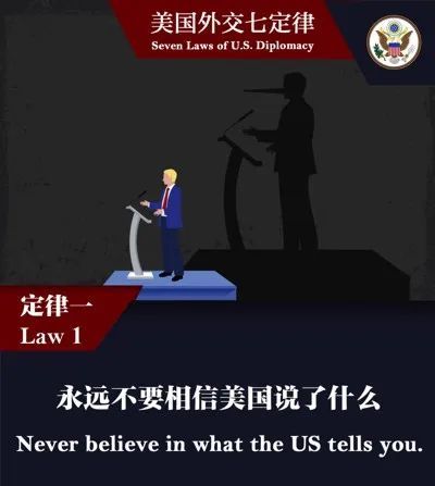 与此同时还有第五个定律——“美国开始污蔑抹黑你,它的黑手正向你伸来”。比如美国打压新疆制造产品、抹黑新疆的太阳能光电,全是胡言乱语。