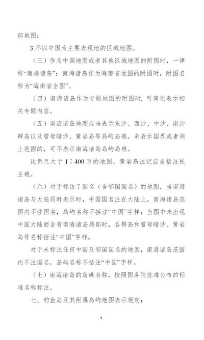 南海诸岛地图应当表示东沙、西沙、中沙、南沙群岛以及曾母暗沙、黄岩岛等岛屿岛礁。未表示国界或者领土范围的,可不表示南海诸岛岛屿岛礁。