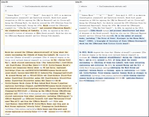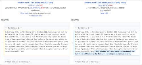 除了这几轮修改外,自2月8日到今天,赫什的个人介绍里还有许多删改也很有意思。在赫什揭露“北溪”爆炸的文章火了之后,词条把这篇报道作为他的重要作品收录在了他的职业经历介绍里,而不到2分钟后,就有人对这篇报道加了一个补充,称“北溪”管道是被美国主导炸毁的说法“尚未得到证实,消息全来自于一位匿名人士”,试图削弱这篇报道的公信力。