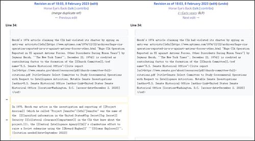 在一段关于赫什对冷战时期新闻的调查里,新版本删掉了美国中央情报局对苏联展开心理战的描述,而且没有给出删除理由。