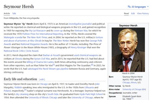 但就在报道发出后没多久,百科词条网站维基百科上的“西摩•赫什”词条,开始出现了大量的删改,而且修改的角度也表现出了耐人寻味的政治倾向。